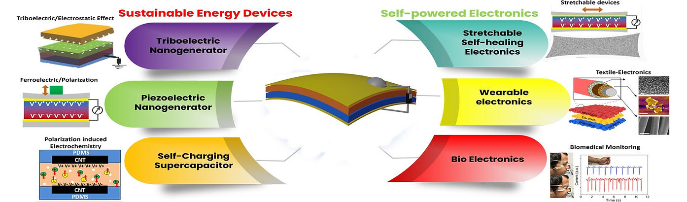 One of the major focus areas of our research in the development of Triboelectric Nanogenerators (TENGs). We delve into pioneering advancements that harness the intriguing phenomenon of triboelectricity to revolutionize energy harvesting technologies. Through innovative design and material engineering, our work aims to enhance the efficiency, scalability, and practicality of TENGs as sustainable power sources for practical industrial applications. With a focus on developing cutting-edge materials, polymers, and novel device concept we strive to contribute to the transformative landscape of renewable energy generation and pave the way for a more self-sufficient and sustainable future.
